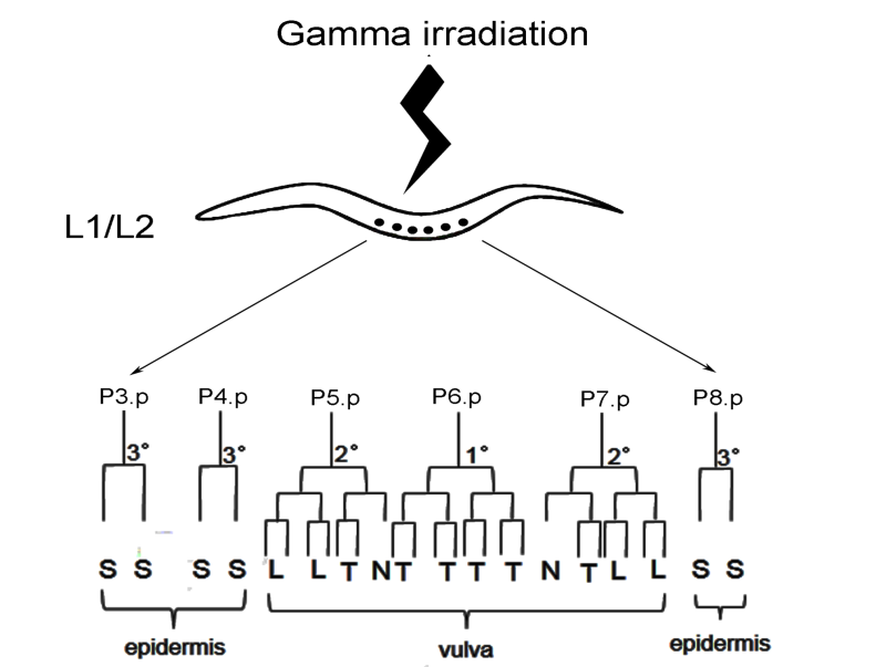 图1. 辐射诱导线虫阴门细胞增殖性死亡的活体组织模型。