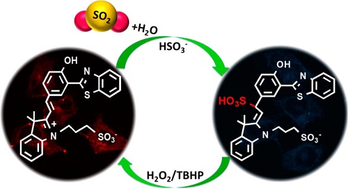 环境中过量的二氧化硫以及亚硫酸氢根不仅造成酸雨等环境危害,还严重影响人体呼吸系统和身体健康。在食品工业中,二氧化硫和亚硫酸氢根还广泛作为食品漂白剂和食品保鲜剂,但是过量摄入则对人体健康造成严重的危害。在生物体内,其为含硫氨基酸等生物分子的氧化代谢产物之一,病理研究发现肺炎及慢性肾衰竭患者体内亚硫酸盐的含量会明显上升。因此发展针对二氧化硫和亚硫酸氢根的高灵敏、高特异性的检测方法对于环境监测、食品安全和相关疾病研究都有重要的意义。