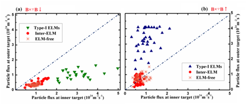 EAST具有灵活的控制系统,可在不同纵场方向下运行,均获得了ELMyH-mode等离子体放电。在射频波加热、下单零(LSN)位形条件下,首次观测到不同环向场方向导致ELMs(尤其Type I ELMs)期间内外靶板粒子流沉积明显不对称:在离子梯度漂移向下条件下,偏滤器内靶板的粒子流大于外靶板;而离子梯度漂移反向后,偏滤器外靶板的粒子流大于内靶板,且ELM期间不对称性明显被强化。