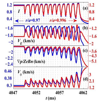 分析表明从径向力平衡的角度理解L-H转换期间的极限环振荡和H模功率阈值是同一现象的不同侧面。在压强梯度逆磁漂移速度的正反馈机制成为主导之前,极向旋转与湍流之间的负反馈机制维持了L-H转换期间的极限环振荡,ExB流与湍流强度之间表现出ExB流振荡幅度和相位由逆磁漂移速度主导或由极向旋转主导的两种不同类型的极限环振荡。逆磁漂移速度对ExB流占主导作用,分析显示H模阈值功率与等离子体线平均密度和磁场成线性依赖关系。物理模型的建立为解释实验现象和预测未来装置的L-H转换提供了有力的分析工具。