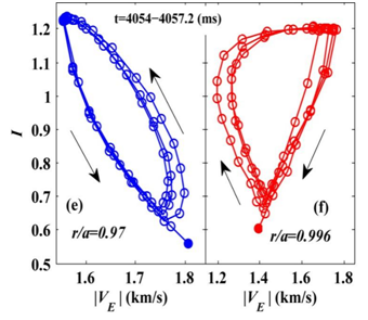 图:L-H转换的一维物理模型分析中,不同径向位置呈现两种不同类型的极限环振荡,靠近边界分界面的极限环振荡相位关系与EAST边界探针诊断结论一致。(a) 湍流强度,(b) 径向电场的ExB速度,(c) 压强梯度的逆磁漂移速度,(d)极向旋转速度,(e,f) 不同径向位置湍流强度与ExB速度的相位关系。