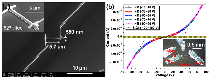图1.(a)利用聚焦离子束沉积技术制备的微器件的SEM照片(b)两端法测量得到的单根PTCDA纳米棒的I-V(电流-电压)曲线。(a)图中的插图为器件的放大的SEM照片,(b)图中的插图为器件的光学显微照片。