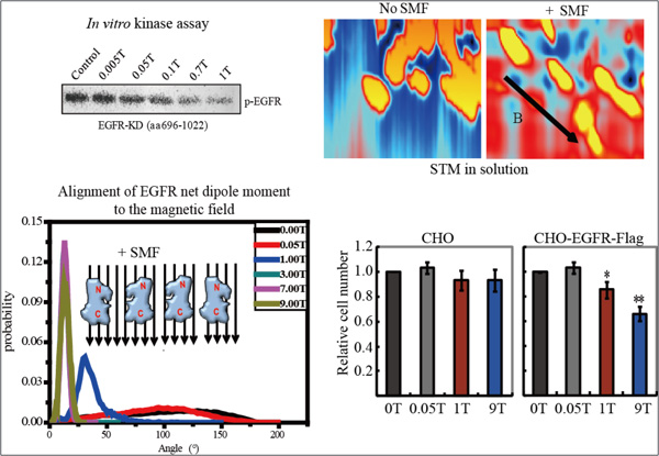 近年来的一些实验证据表明稳态磁场能够抑制一些肿瘤细胞的生长,然而,目前此领域的研究缺乏系统性和深入性,导致磁场对肿瘤细胞的生物学效应并不明确,机制并不清楚。科研人员通过比较不同类型的细胞在不同强度稳态磁场下的生长增殖响应,发现大多数高表达表皮生长因子受体(EGFR)的肿瘤细胞生长受到抑制,进一步体外实验研究表明EGFR纯化蛋白的活性能够直接被稳态磁场所抑制。溶液扫描隧道显微镜单分子成像和理论计算模拟显示,中高强度的稳态磁场能够改变EGFR 蛋白的排列方向,影响其二聚体之间的不对称结合,从而对其激活产生抑制效应。另外,通过比较不同EGFR表达量的细胞,发现稳态磁场可以抑制EGFR高表达的结肠癌细胞和鼻咽癌细胞、以及转染了人源EGFR的中国仓鼠卵巢细胞(CHO,非肿瘤),但是对于CHO细胞本身、以及转染了失活人源EGFR的CHO细胞并没有明显的抑制效果。因此,EGFR是肿瘤细胞增殖受稳态磁场抑制的重要因素之一。