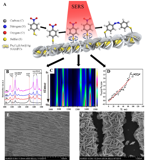 图:(A) Fe3O4@Au@Ag磁性等离子体激元纳米链作为SERS基底监测4-NTP到DMAB的示意图; (B) Fe3O4@Au@Ag NAMPCs作为SERS基底用于研究不同时间的4-NTP转化为DMAB的SERS光谱; (C) 4-NTP二聚为DMAB的2D SERS色码强度图; (D) 4-NTP二聚为DMAB的等离子光催化反应动力学; Fe3O4@Au@Ag NAMPCs的(E)SEM和(F)局部放大SEM图。
