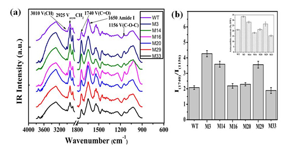 图1:(a)雨生红球藻不同突变藻株的红外光谱;(b)红外光谱吸收强度比值I(1740)/I(1156)光谱强度比值与虾青素含量的关系