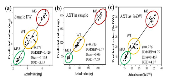 图3:基于NIRS对雨生红球藻生物量(a)、虾青素含量(b)及其百分含量(c)的预测模型及分析