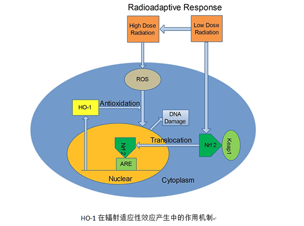 辐射适应性效应是低剂量辐射诱导的众多复杂生物学效应中的一种。机体受到低剂量辐射后,会对后续的中高剂量产生一定抗性,在放射治疗中会降低处方剂量的实际治疗效果。辐射适应性效应的产生机制目前尚不明确。韩伟课题组对其分子机制进行深入研究,发现:低剂量辐射会导致转录因子Nrf2由细胞质向细胞核发生转移,继而激活血红素加氧酶1(HO-1)转录,表达量显著上升;HO-1具有较强的抗氧化能力,显著降低了后续高剂量辐射导致的氧自由基产生量,保护细胞使其产生一定的抗性。该研究为辐射适应性效应产生的机制提供了“答案”。