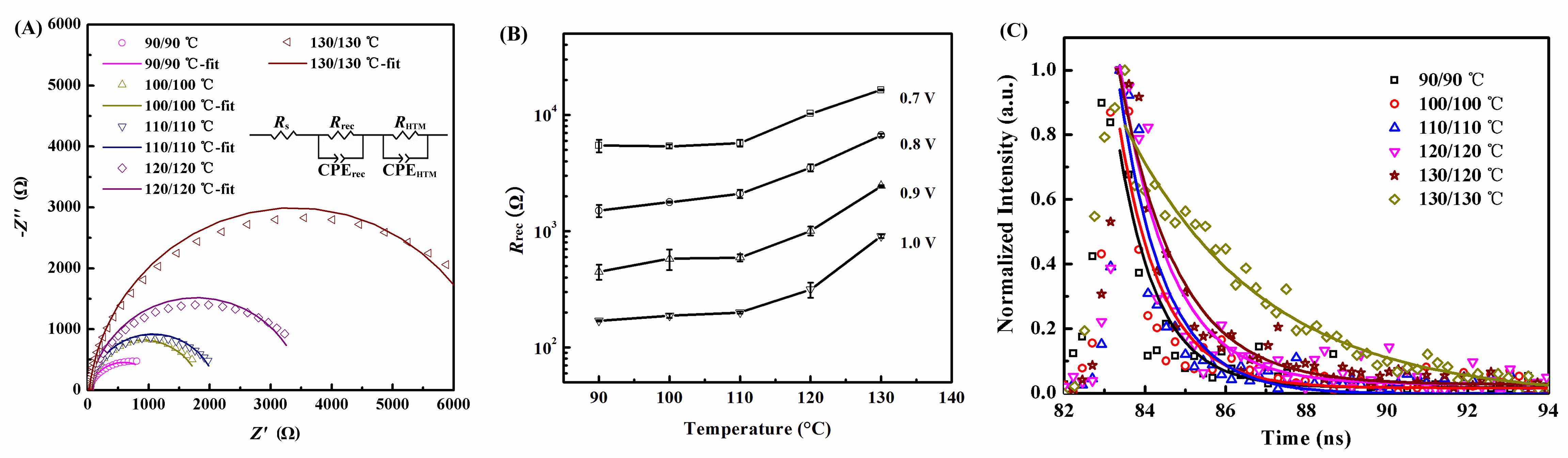 图1. (A)0.8V偏压下不同PbI2含量PSCs的电化学阻抗谱;(B)不同偏压下不同PbI2含量PSCs的复合阻抗;(C)不同PbI2含量CH3NH3PbI3薄膜的荧光寿命谱。