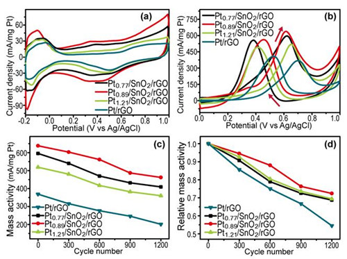 得益于Pt纳米颗粒均匀的分布和超细的粒径(1-2 nm),合成的Pt/SnO2/rGO催化剂具有很大的电化学活性面积(图2a),且对甲醇氧化展现出很高的催化活性(图2b)。此外,通过该合成方法得到的Pt催化剂与SnO2载体界面处的协同作用能有效提高Pt催化剂的抗CO中毒能力。因此,与Pt/rGO催化剂相比, Pt/SnO2/rGO催化剂对甲醇氧化均展现出更好的循环性能(图2c和d)。该方法为超细贵金属催化剂的发展提供了一种新的研究思路。