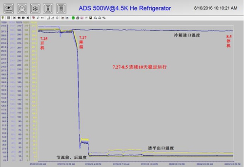 项目负责人张启勇研究员汇报了500W/4.5K氦制冷机的设计,研制和调试情况,并针对专家组提出的问题进行了解答。随后,专家组现场考察了500W/4.5K氦制冷机的运行情况,查看了运行数据与曲线并进行现场测试。氦制冷机在室外温度38℃环境下连续稳定运行10天,在制冷模式下测试的制冷量达到了550W,实现了在液化模式与制冷模式下参数调节的自动控制与安全保护。
