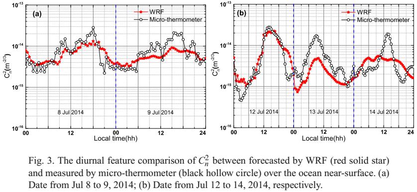 课题组博士研究生青春等利用自定义的WRF输出产品,基于Monin-Obukhov相似理论计算了南海近海面大气折射率结构常数,并用外场实验数据验证了该结果的正确性。验证结果表明,预报的
