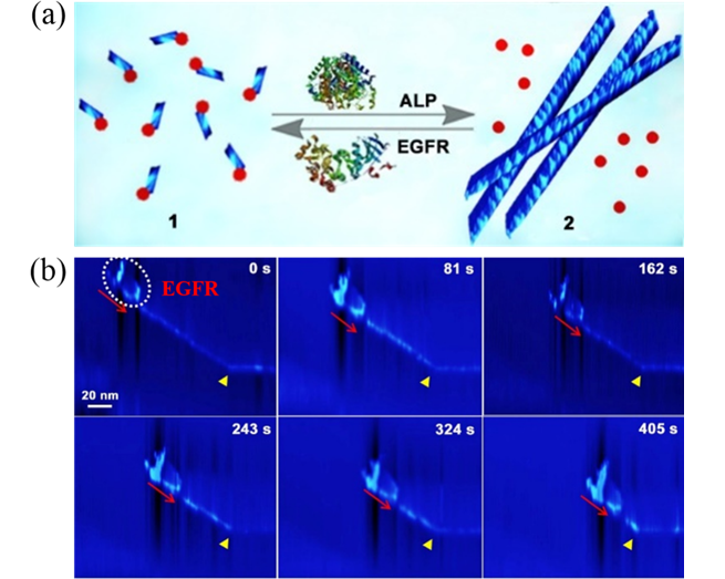 (a) 小分子组装/解组装示意图,(b) 表皮生长因子受体激酶(EGFR)控制的解组装动态STM成像。