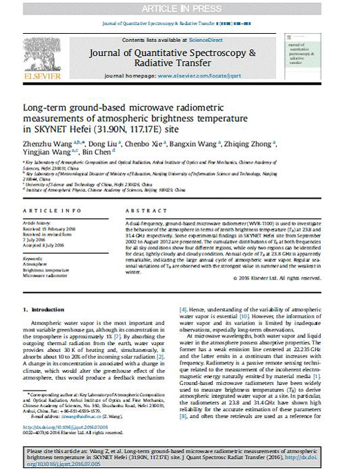 近期,安光所大气光学中心科研人员王珍珠等人利用国际SKYNET合肥超级站双频微波辐射计长期测量结果,对合肥地区大气亮温进行了深入研究,并取得新进展,其结果发表在J Quant Spectrosc Radiat Transfer上。