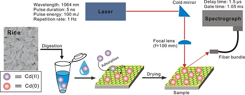 电化学方法与激光诱导击穿光谱联用在层层组装氧化石墨烯上检测大米中微量Cd(II)的示意图