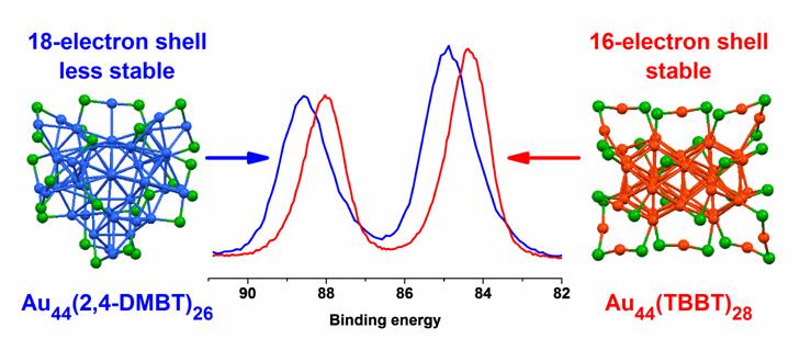图 2. Au44(2,4-DMBT)26与Au44(TBBT)28纳米团簇的XPS能谱和结构比较(为了简化Au44(2,4-DMBT)26和Au44(TBBT)28纳米团簇的结构,将C和H原子忽略)[2]。