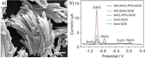 图:a) 多孔NH2/SnO2纳米线SEM图;b) NH2/SnO2-RTIL纳米复合材料修饰玻碳电极高灵敏、高选择性检测Cd(II)的研究
