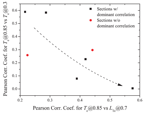 通过相关性分析发现台基-内部输运垒相关性增加的同时台基-芯部的相关性降低。因此,可从该实验中得出结论:大半径内部输运垒的形成对芯部等离子体具有屏蔽效应,同时隔绝了ELM崩塌造成的扰动。这种特性打破了一直以来认为的台基高度决定芯部等离子体性能的状态。