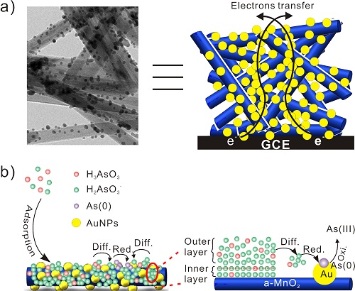 图1:a)电子传递路径;b)Au/α-MnO2纳米复合材料修饰的玻碳电极检测As(III)的原理图