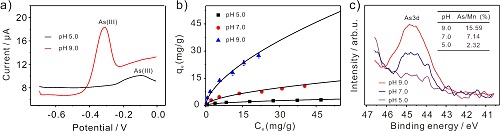 图2:a)是Au/α-MnO2纳米复合材料修饰的玻碳电极分别在pH 9.0与pH 5.0的介质中检测10 ppbAs(III)的信号图;b)与c)分别是Au/α-MnO2纳米复合材料在不同pH介质中对As(III)吸附的等温线及As(III)的高分辨XPS谱图