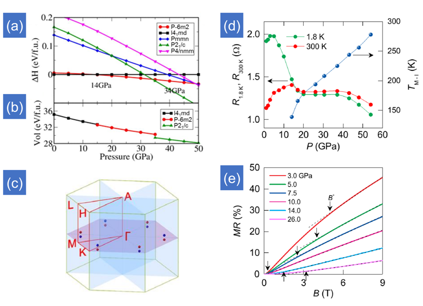图1. (a) TaAs晶体高压下各种可能结构相的焓值计算;(b)结构预测的TaAs晶胞体积-压力关系曲线;(c) TaAs高压六方相P-6m2第一布里渊区的外尔点分布示意图;(d) TaAs单晶中绝缘-金属转变温度TM-I,1.8K和300K电阻随压力变化的曲线;(e) TaAs单晶不同压力下的等温(4.5K)磁阻曲线,其中,虚线代表线性拟合结果,箭头代表偏离线性行为的特征磁场。