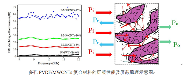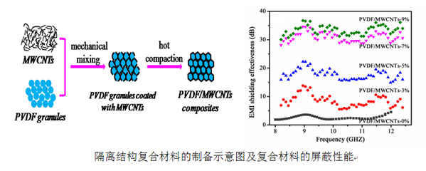随着现代计算机以及通信技术等的广泛应用,电磁干扰问题日益严重。发展高性能的电磁屏蔽材料,成为了众多科研工作者的目标。相比于传统金属屏蔽材料,高分子复合材料因具有质轻、抗腐蚀、易于加工、导电性可调控等突出优点,近些年成为了研究的热点。应用所研究组选用具有高导电性的多壁碳纳米管(MWCNTs)为功能材料,耐化学腐蚀、耐高温等性能优异的聚偏氟乙烯(PVDF)为高分子基体。一方面,通过调控碳纳米管在共混相中的选择性分布,采用热压和刻蚀的方法制备了PVDF/MWCNTs纳米复合轻质板材,由于该材料独特的结构设计,获得了优异的电磁屏蔽性能。另一方面,采用相分离技术制备了PVDF微球,并通过共混与热压的简易方法,获得了具有独特隔离网络结构的氟塑料基纳米复合材料,该材料呈现出了优异的抗电磁干扰性能,并且是一种以吸波为主要机制的屏蔽机制。
