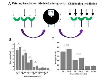 图:微重力和辐射适应性反应耦合实验示意图(A);辐射适应性反应的诱导剂量组合(B);微重力条件下辐射适应性反应的抑制情况(C)