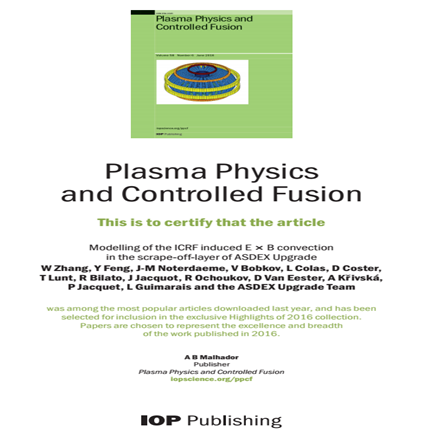 日前,等离子体所托卡马克物理研究室博士生张伟等人在射频波引起的边界等离子体对流输运研究方面取得新进展,相关研究成果以Modelling of the ICRF induced E ×B convection in the scrape-off-layer of ASDEX Upgrade为题,发表在核聚变顶级期刊《等离子体物理与可控聚变》(Plasma Physics and Controlled Fusion,58 095005 (2016))上。该文章被期刊选为2016年度最具影响力文章之一。