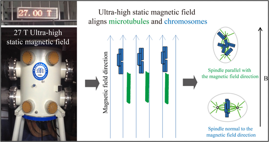 目前的研究表明,纯化的微管能够在中高强度的磁场下整齐排列,并且排列的效果与磁场强度呈显著正相关。人们推测微管是磁场作用于有丝分裂纺锤体的重要靶点,然而却一直缺乏细胞水平的实验验证。同时,由于磁体条件等的限制,目前国际上对于稳态磁场下的生物样品最高研究到17T,而20T以上的生物学效应研究尚属空白。