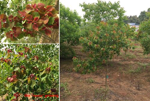 目前,课题组以我国乡土树种乌桕为对象进行研究取得成功。通过技术应用发现,诱色素制剂可成功调控乌桕叶色,春夏两季也能高效诱导乌桕叶片变红。该技术由倪军博士带领研究生研发成功,已申请国家发明专利。