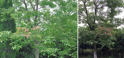 诱红素处理乌桕两周后叶色变化(左:对照;右:处理)
