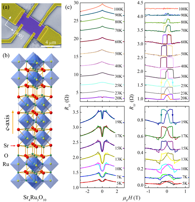 (a)样品扫描电镜SEM图;(b) Sr4Ru3O10晶体结构;(c)不同温度下的面霍尔效应 (样品厚度:34 nm)。
