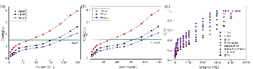 图2.(a)HAP纳米线对氟离子的吸附行为;(b)Al-HAP纳米线对氟离子的吸附行为;(c)HAP纳米线对有机物的吸附行为