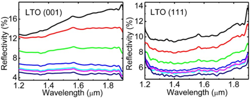 图1. 不同温度下钛酸锂超导薄膜的近红外反射光谱。左、右图分别为[001]和[111]晶向的结果。
