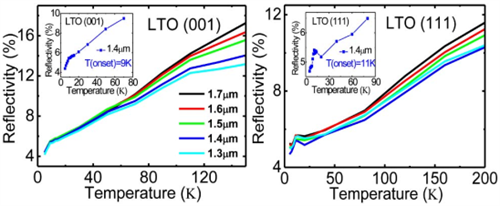 图2. 不同波长的钛酸锂超导薄膜反射率随温度变化,左、右图分别为[001]和[111]晶向的结果。