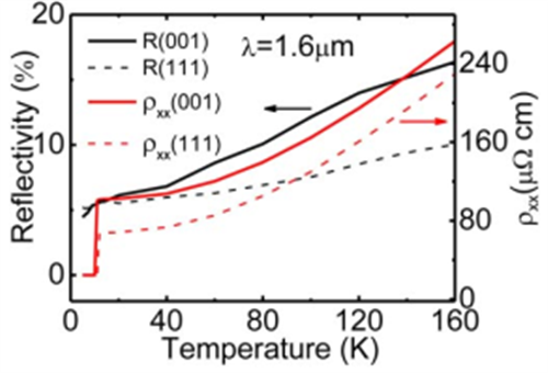 图3. 不同晶向超导钛酸锂薄膜的反射率(黑线)和电阻率(红线)随温度的变化,实线、虚线分别为[001]和[111]晶向样品的测量结果。