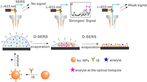 动-SERS过程中产生的最佳热点结合内标分子用于定量检测的过程示意图