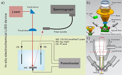 (a)原位光谱电化学LIBS设备原理图;微区液体排空装置设备的分解图(b)和剖面图(c)
