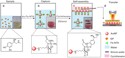 智能所杨良保研究员等利用表面共振增强拉曼光谱(SERRS)技术并结合界面组装的方法,实现了对复杂环境中肾上腺素的选择性检测。相关成果已发表在美国化学会旗下的ACS applied materials & interfaces (2017, 9, 7772-7779)杂志上。