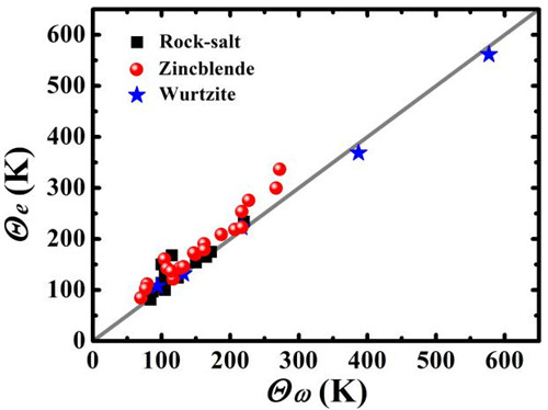 图1. 3种不同结构类型的化合物利用弹性常数计算得到的德拜温度Qe与利用声子性质得到的德拜温度Qw的对比图。