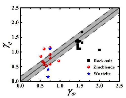 图2. 3种不同结构类型的化合物利用弹性常数计算得到的格瑞乃森常数ge与利用声子性质得到的格瑞乃森常数gw的对比图。