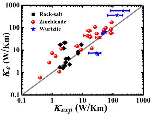 图3. 3种不同结构类型的化合物利用弹性常数计算得到的热导率ke与实验测得的热导率kexp的对比图。