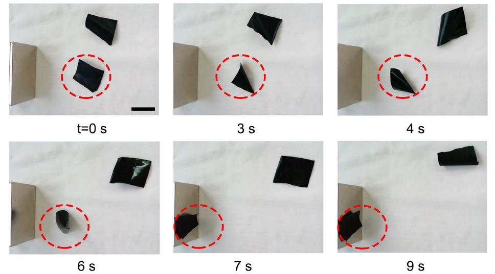 利用多元醇掺杂的聚吡咯薄膜对湿度具有灵敏的响应性,在湿度的驱动下能够作出连续的翻转运动。研究人员利用聚吡咯薄膜的这一响应特性,通过在薄膜中掺入磁性纳米粒子,设计了湿度驱动的柔性“牵引机”,外界磁场能够有效控制薄膜的运动方向。这种柔性的驱动器可以有效地把环境中的能量转换为动能,并可运输货物至目的地。