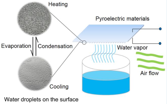此外,基于对温度具有响应性的聚合物-聚偏氟乙烯,研究人员设计了水汽驱动的热释电纳米发电机,它利用水蒸汽的冷凝放热和蒸发吸热实现热释电材料的温度快速波动,不需要额外耗电设备。供电性能好,可获得高达145伏的输出电压,并可以持续驱动低功耗的电子器件,如电子表等。作为一种柔性能源转换器件,可有效收集环境中的废热,转化为电能用于发电,该工作发表在Nano Energy (2016) 22 ,19-26。