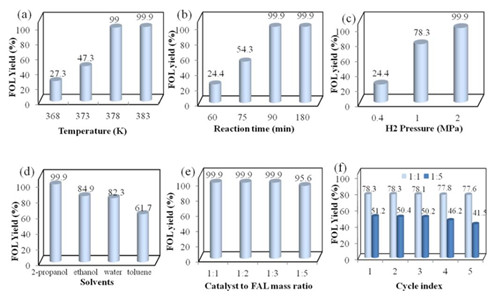 图2. 反应参数对糠醛加氢性能的影响及催化剂的循环稳定性。