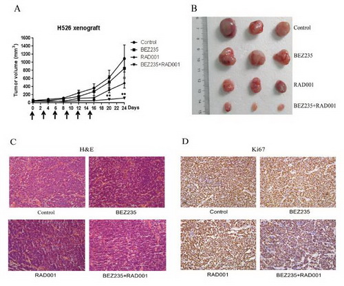 图:BEZ235和RAD001的联合使用显著地抑制H526小细胞肺癌小鼠移植瘤的生长