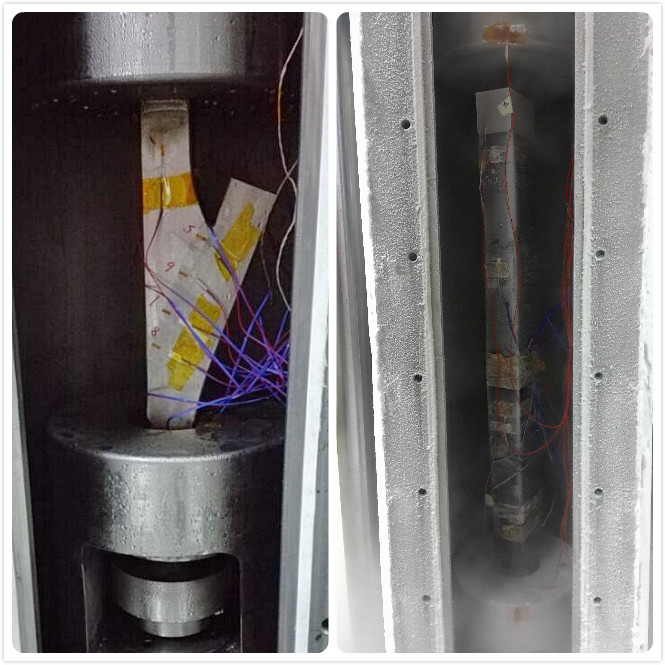 ITER PF6线圈尾段模拟件2(左)及3(右)在77 K下机械疲劳测试