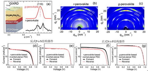 图(a)略入射XRD测量示意图,以及有机-无机杂化钙钛矿薄膜的略入射XRD谱(X光入射角度0.2度)。(b)CH3NH3PbI3-xClx 薄膜二维GI-XRD谱;(c)优化CH3NH3PbI3-xClx 薄膜后(g-perovskite)处理条件后测量的二维GI-XRD谱。基于(d) r-和(e) g-钙钛矿薄膜的反式P-i-N结构器件J-V曲线。(f)和(g)正式N-i-P结构器件J-V曲线。