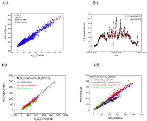 (c) 不同相对湿度下,CRDS和CEAS测量相关性分析,不同颜色代表不同的相对湿度;