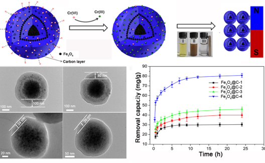 课题组制备出一种结构可控的磁性多孔纳米复合材料,其粒径、碳层厚度和活性基团数量可由前驱物质浓度方便调节。该材料具有多孔结构、高比表面积和大量活性基团,可以高效抓取水体中的六价铬,进而将其还原为微毒性的三价铬,并通过磁场将该材料连同铬移出水体。该方法环境友好、工艺简单、成本低、可重复利用,具有较高的应用价值,为修复重金属污染提供了强有力的技术支撑。