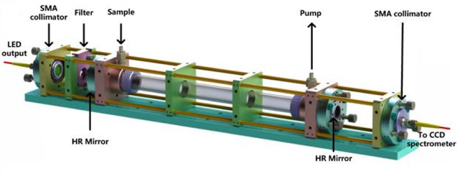 大气乙二醛是反应性有机物降解过程中重要的中间态组分,是有机物降解机制及其对O3和细粒子生成影响研究的关键。课题组方波、赵卫雄等人研发了一套便携式高灵敏度宽带腔增强光谱仪,工作在440-480nm波段,实现了大气CHOCHO的在线测量。该仪器在光学结构和后端数据处理两个方面对传统的宽带腔增强技术做了改进:标准笼式结构设计及SMA光纤接头准直器,提高了光腔耦合效率,结构紧凑、稳定性好;采用自适应卡尔曼滤波(Kalman filter)技术后,在21s采样时间下,CHOCHO的测量精确度可达到8pptv,达到国际领先水平。
